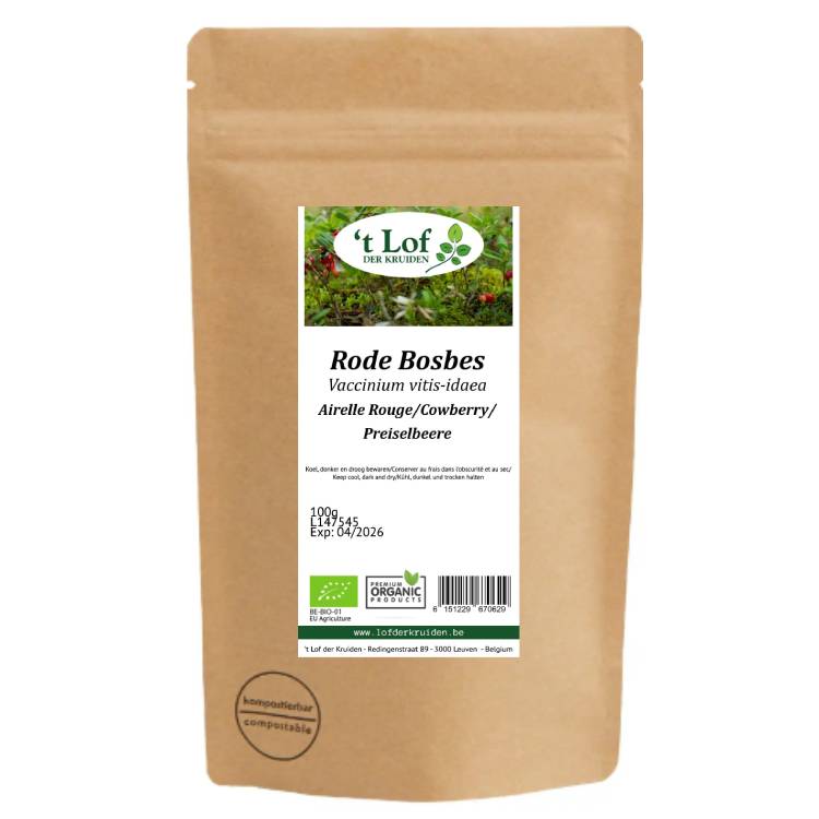 Rode bosbes, ook bekend als lingonberry, is een kleine felrode bes die groeit op zure bosgronden in het noorden van Europa. De bessen worden traditioneel gebruikt in de volksgeneeskunde en de Scandinavische keuken vanwege hun antioxidanten en hoog vitamine C-gehalte. Ze worden vaak ingezet als zuiverende vrucht, met name ter ondersteuning van de urinewegen, de weerstand en de spijsvertering. Dankzij hun frisse, licht wrange smaak zijn ze ook lekker in mengsels met zoetere kruiden of vruchten.