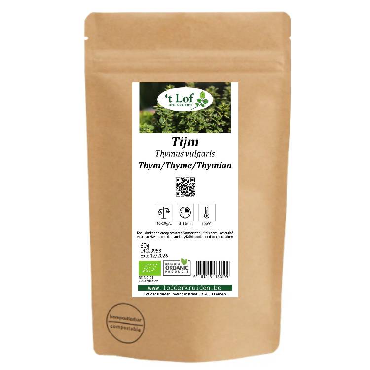 Tijm bio of Thymus vulgaris is niet alleen een keukenkruid maar als thee heeft dit kruid ook een werking op de luchtwegen. Tijm werd vroeger door het weerstandsverhogend effect ook wel ”het antibioticum van het arme volk” genoemd. Plantkundige Dodoens (1517 – 1585) beschreef tijm al heel uitvoerig en raadde het kruid o.a. aan bij hoest en ”kortheid van adem”, bij taaie slijmen, bij opgeblazenheid en winden.